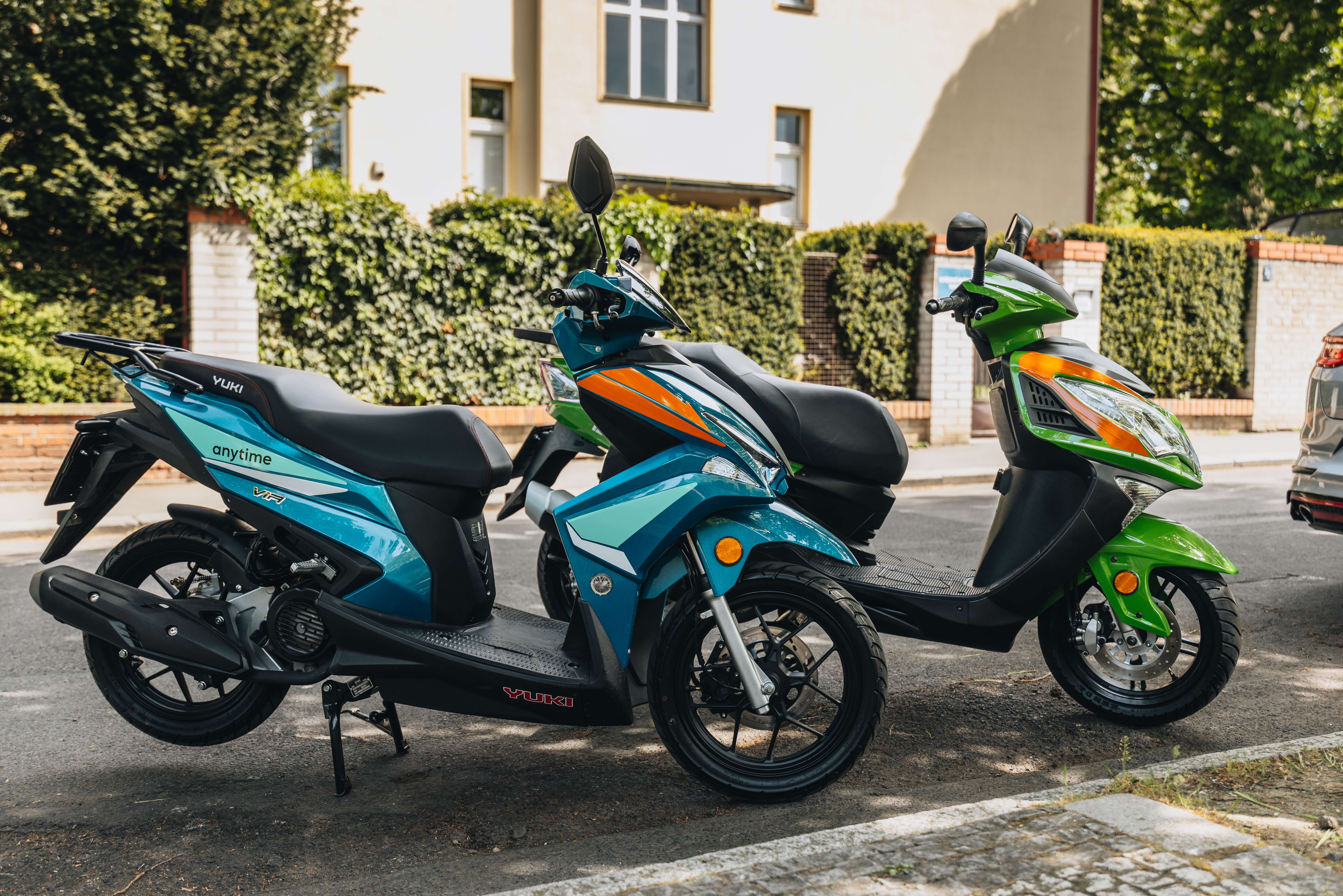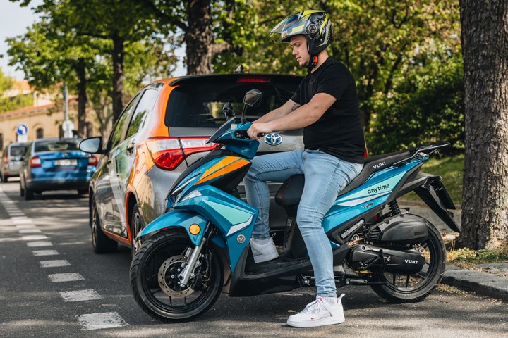 Anytime carsharing také rozšiřuje své působení o novou službu a vedle sdílených automobilů přichází s nabídkou sdílených skútrů. Aktuálně se jedná o 60 motorových skútrů Yuki 125i Via a Yuki 125i Matrix. Skútry jsou vybaveny vzduchem chlazenými čtyřtaktními motory o objemu 125 ccm. Model Via má 14ti palcová kola, LCD displej, full led světlomety a USB port pro nabíjení mobilních telefonů. Model Matrix pak 13ti palcová kola a USB port pro nabíjení mobilních telefonů. Oba modely disponují zadním nosičem zavazadel. Via má pro bezpečnu jízdu v úložném boxu v zadní části motorky umístěné dvě helmy, Matrix pak jednu pod sedačkou skútru.