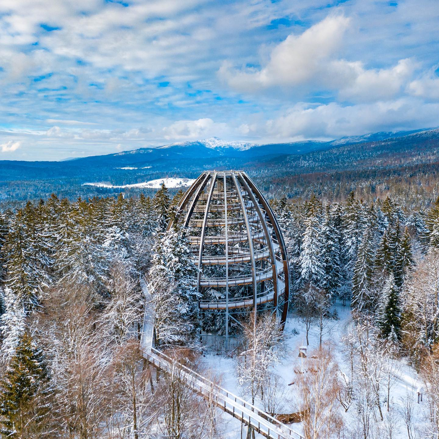 Bavorský les láká všechny návštěvníky na úžasný zážitek v nádherné přírodě. Poblíž městečka Neuschönau máte možnost procházet se mezi korunami stromů ve výši až 25 metrů nad zemí. Na konci 780 metrů dlouhé dřevěné visuté stezky pak můžete půl kilometru stoupat na 44 metrů vysokou vyhlídku, zvanou bavorská Eiffelovka, z níž uvidíte nejen na německou stranu Bavorského lesa, ale i na Luzný, jednu z nejhezčích šumavských hor.