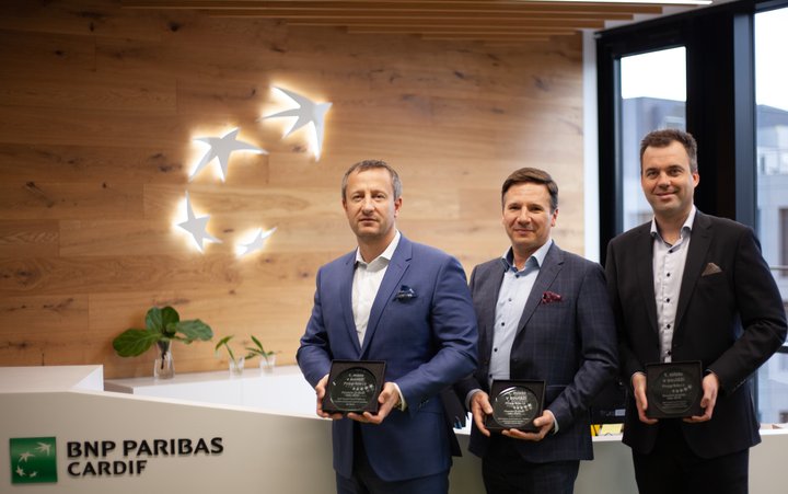 BNP Paribas Cardif Pojišťovna již potřetí dominovala soutěži Finanční produkt roku 2021 v kategorii pojištění schopnosti splácet, zleva: Zdeněk Jaroš, Martin Steiner, Michal Tuček, všichni BNP Paribas Cardif