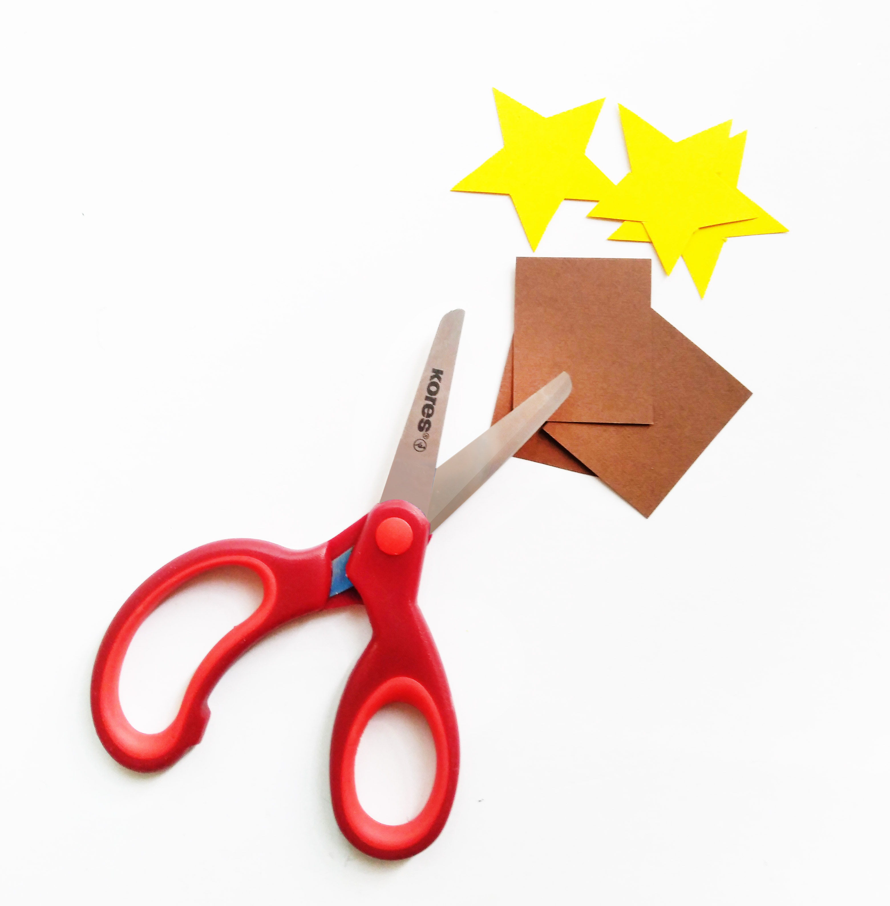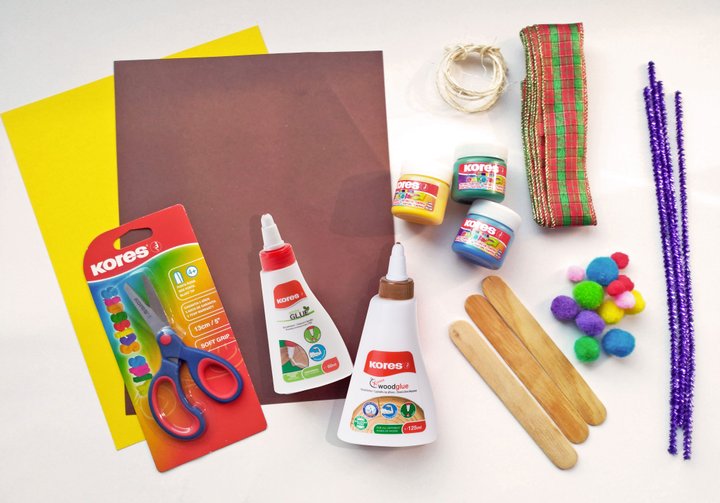 Kores White Glue, Kores Wood Glue, Kores nůžky, Kores temperové barvy Témperas, kartonový papír (žlutý a hnědý), dřevěné špachlte, dřívka od nanuků,