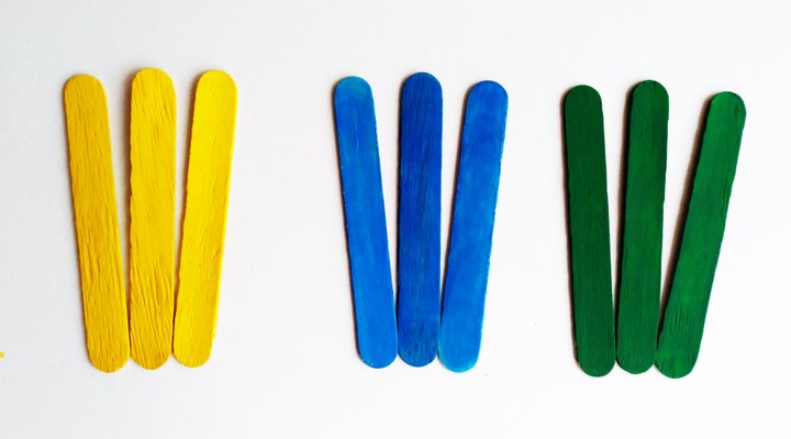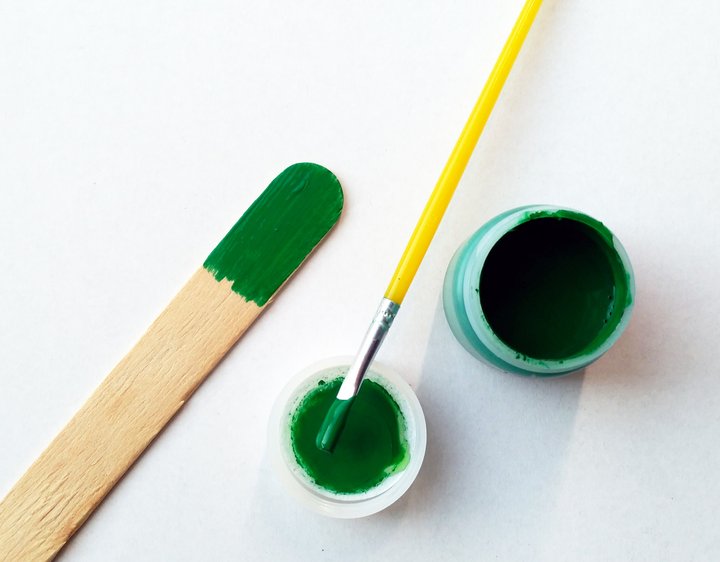 Nejdříve nabarvíte dřevěné špachtle pomocí temperových barev Kores. Vyberte si své oblíbené barvy a vytvořte si tolik barevných variací, kolik si přejete.