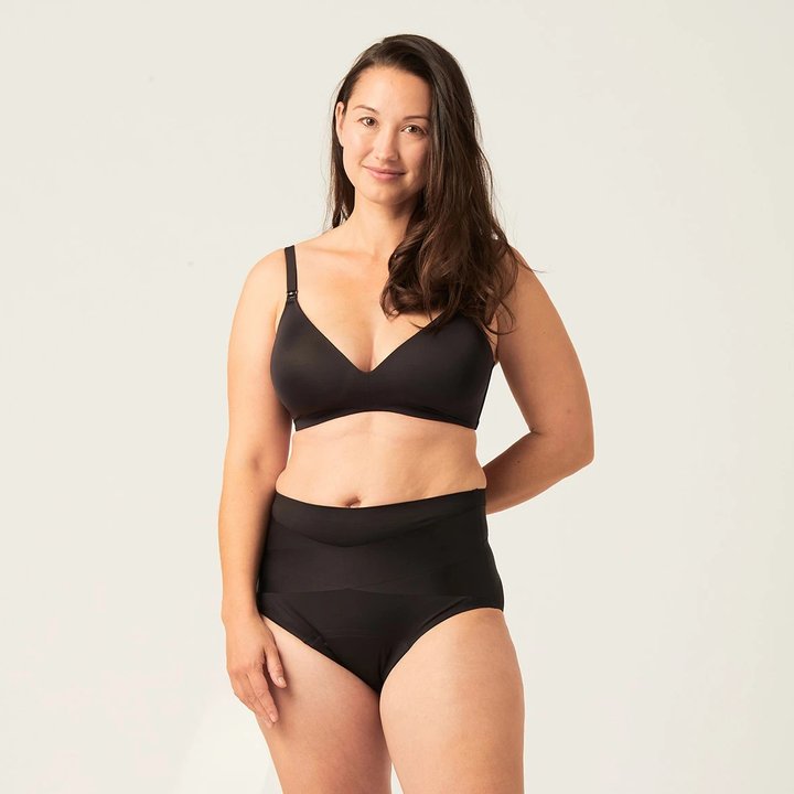 Skvělé budou také menstruační kalhotky vyšší savosti. Rozhodně volte kalhotky z přírodních materiálů a střih s vysokým pasem, který příjemně stáhne bříško a nebude okrajem zasahovat do oblasti jizvy po císařském řezu. Naopak kalhotky s nízkým pasem ještě na nějakou dobu raději schovejte do skříně. Nám se osvědčily tvarující poporodní kalhotky Modibodi s merino vlnou.