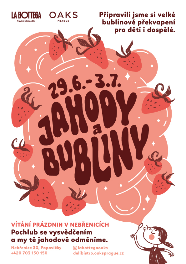 Konec školního roku a letní prázdniny se blíží, nedávno otevřené La Bottega Oaks Deli Bistro v Nebřenicích u Prahy proto připravilo pro všechny děti za jejich studijní snažení a výsledky zaslouženou odměnu. Stejně tak pro jejich rodiče, a to prostřednictvím speciálního jahodového menu z dílny šéfkuchaře Jana Klimenta, které bude servírováno ve dnech 29. června - 3. července. Kdo se pochlubí s vysvědčením, bude jahodově odměněn limonádou a zmrzlinovým pohárem. Všichni si budou moci vyzkoušet bublinové triky a zkusit nafouknout největší bublinu.