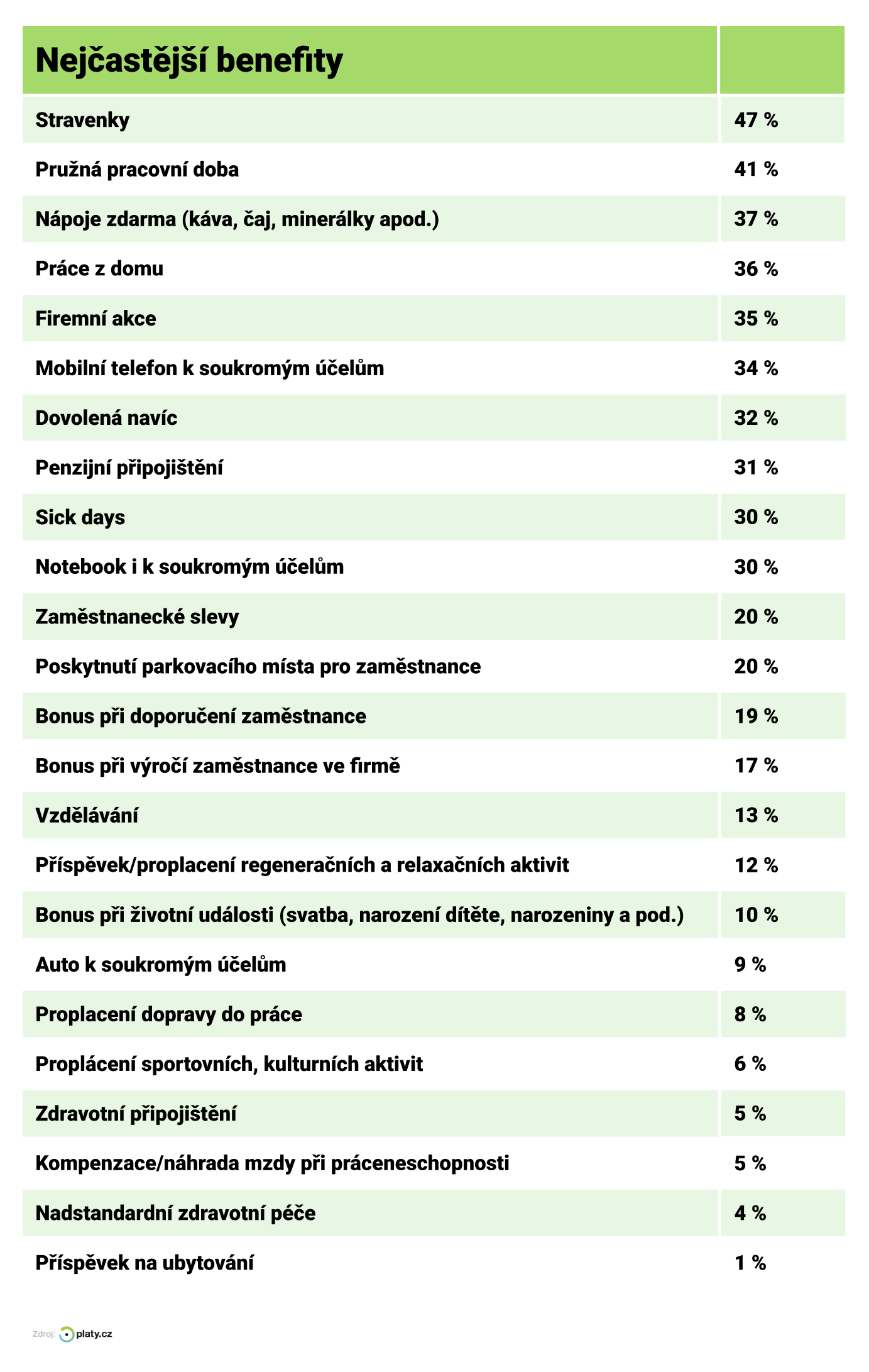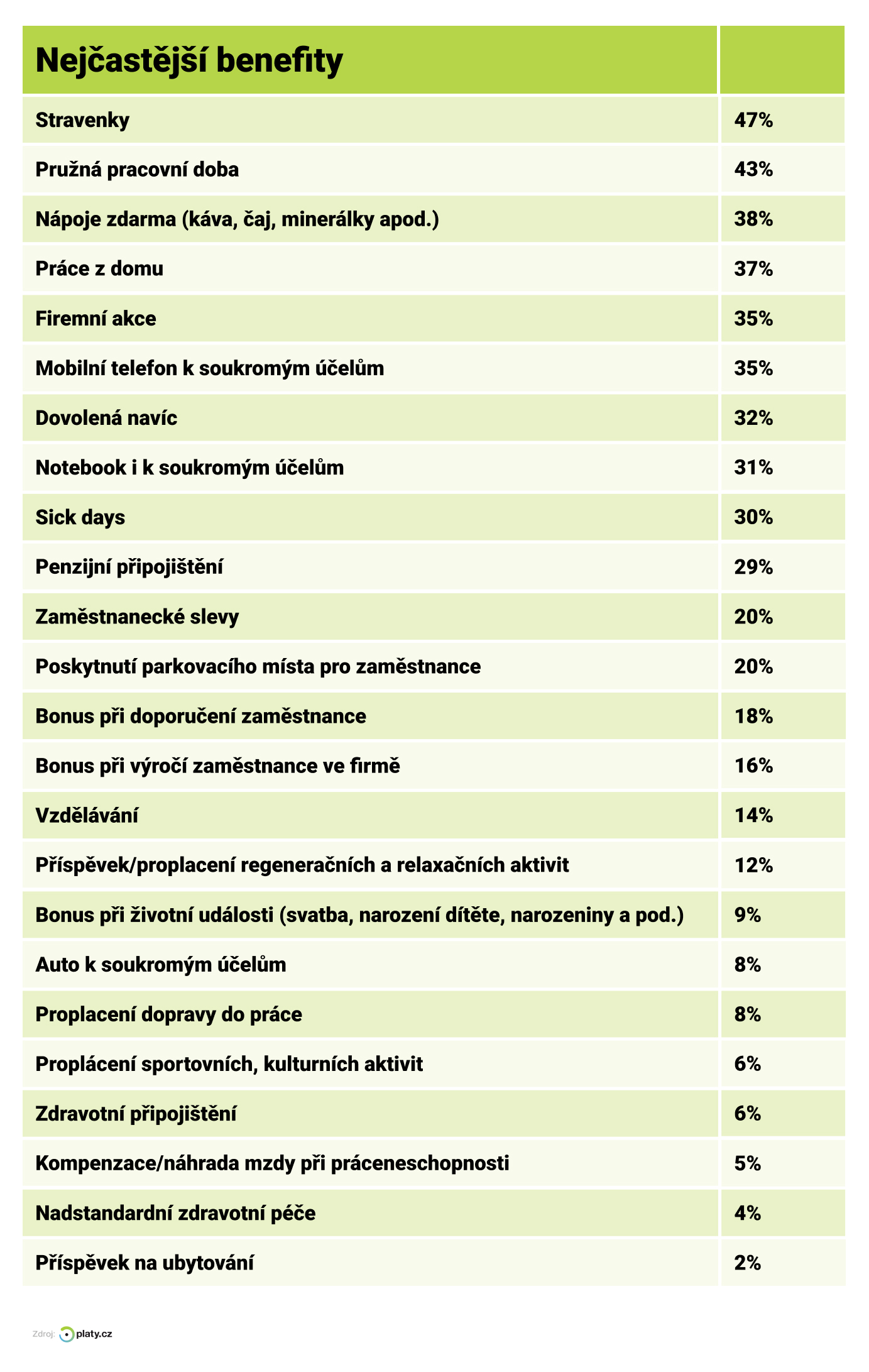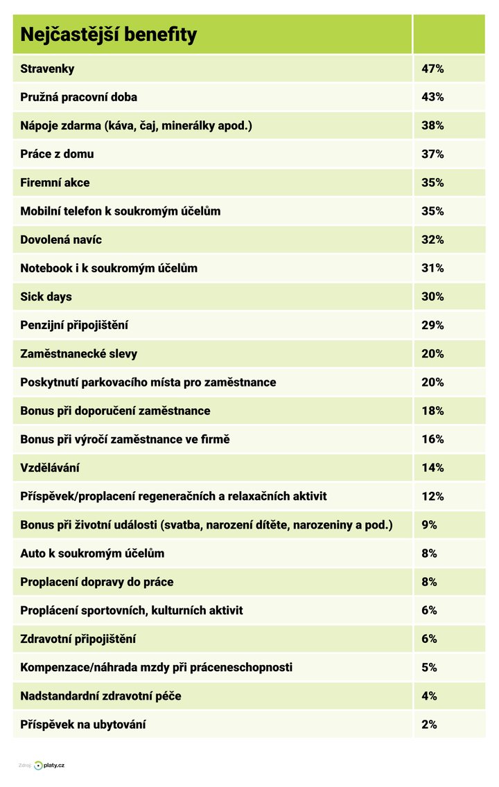 Nejčastější benefity 2024 - Platy.cz