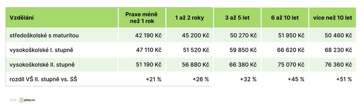 Vysokoškolákům s ukončeným vzděláním magisterského a inženýrského stupně pak podle Platy.cz také roste průměrný výdělek s odpracovanými lety rychleji a mají po jednom roce až dvou odpracovaných letech 56 880 Kč, po 3 až 5 letech 66 380 Kč, po 6 až 10 letech 75 070 Kč a po více než 10 letech praxe 76 360 Kč.