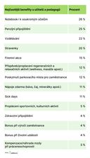 Portál Platy.cz, který se specializuje na srovnávání výše mezd a platů napříč segmenty, profesemi a pracovními pozicemi, zjišťoval nejčastější benefity mezi učiteli mateřských, základních a středních škol. „26 % učitelů může využít pracovní notebook pro soukromé účely, 25 % dostává penzijní připojištění. 22 % přispívá zaměstnavatel na vzdělávání, 20 % dostává stravenky, 15 % využívá firemní akce. Dále 12 % dostává příspěvek či proplacení regeneračních a relaxačních aktivit (wellness, masáže apod.), stejně tak 12 % využívá vlastní parkovací místo. 11 % dostává nápoje na pracovišti zdarma (káva, čaj, minerálky), stejně tak 11 % může využívat sick days,“ říká Miroslav Dravecký z Platy.cz.