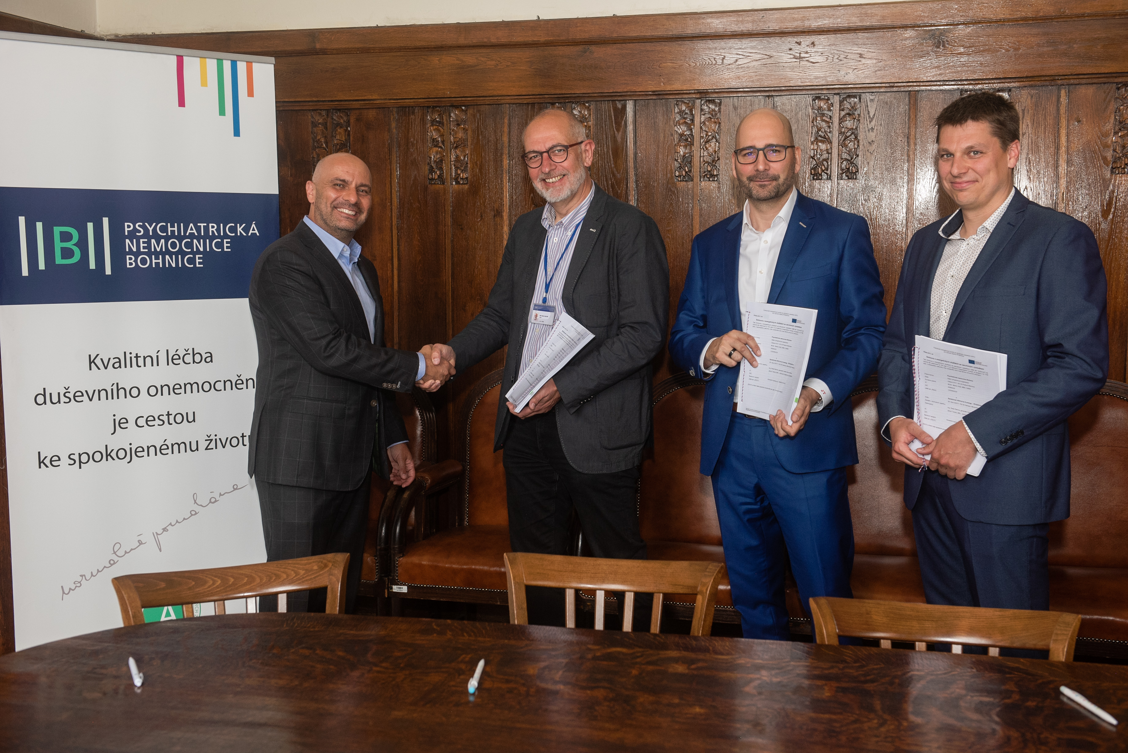 Psychiatrická nemocnice Bohnice podepsala smlouvu na projekt EPC, zleva: Ing. Reda Rahma, generální ředitel Veolia Energie ČR, a.s., MUDr. Martin Hollý, MBA, ředitel Psychiatrické nemocnice Bohnice, Jakub Tobola, MSc., obchodní ředitel Veolia Energie ČR, a.s., Ing. Eduard Paulík, jednatel D-energy s.r.o.