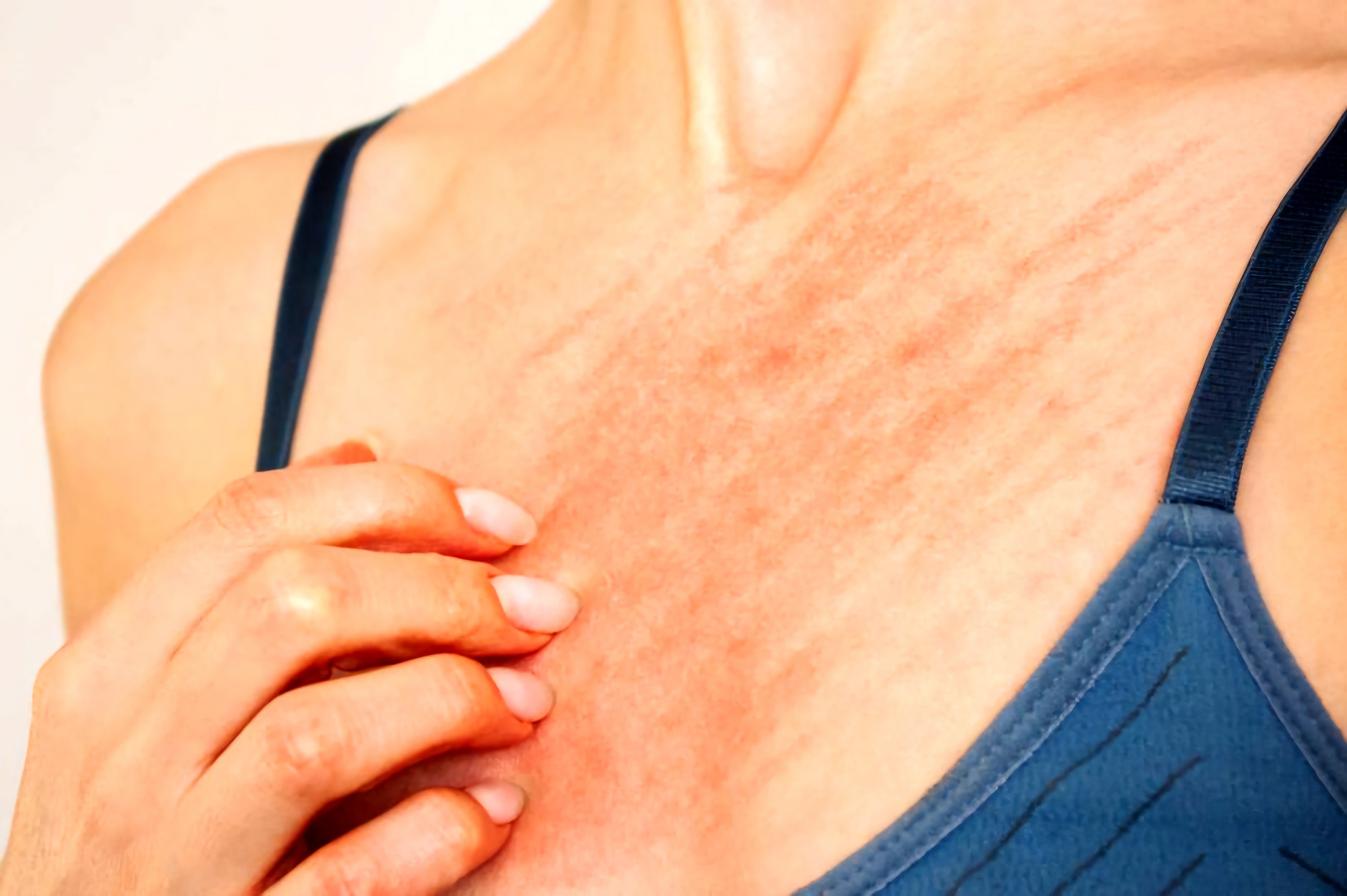 Tělo se brání po svém – zarudnutím, drobnými pupínky, kopřivkou nebo pocitem píchání. Nejčastěji v místech, kde prádlo těsně přiléhá, kolem pasu, v tříslech, pod prsy nebo na bocích. Svědění se často zhoršuje večer, když se kůže zahřeje, nebo po fyzické aktivitě. Pokud dráždivý materiál nosíme dlouhodobě, může se z podráždění rozvinout kontaktní dermatitida – kůže se vysušuje, olupuje nebo dokonce mokvá. U žen hrozí i podráždění intimních partií nebo opakované mykózy, protože syntetické a chemicky ošetřené materiály hůře dýchají a udržují vlhkost.