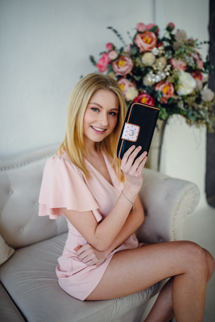 Černá peněženka s dávkou elegance a šmrncu, za kterou vděčí puntíkům a hnědému lemování. Má hlavní zavírání na patent, vnější uzavíratelnou kapsu na zip na mince a praktické vnitřní přihrádky na karty a na fotku.
