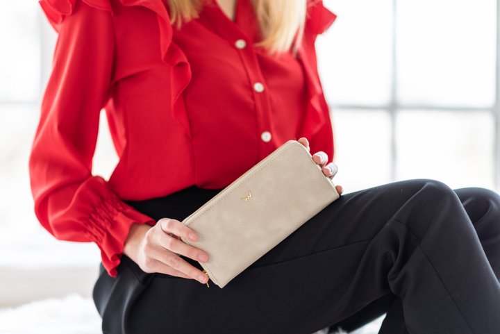 Spojení čistých linií a jemné krémové barvy je receptem na to, jak vytvořit reprezentativní peněženku. Prostorná peněženka, která má hlavní zapínání na zip, kapsu na zip na mince a vnější kapsu na zip. Uvnitř má prostor pro 20 karet.